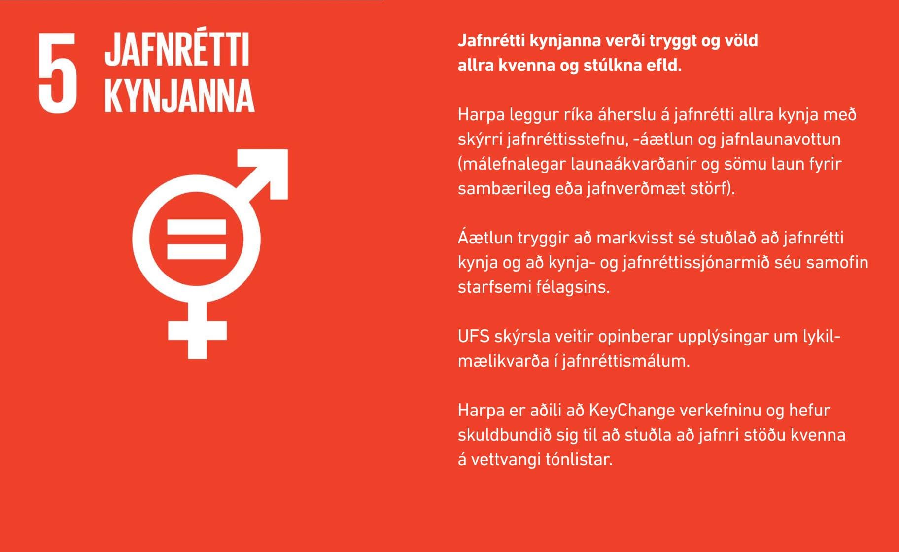 Harpa fylgir eftir fimm Heimsmarkmiðum Sameinuðu þjóðanna en samtals eru þau 17 talsins. Starfsfólk Hörpu kom að því vali til að styðja við innleiðingu á stefnu og sjálfbærniáherslum í starfseminni. Eftirfarandi Heimsmarkmið töldust samræmast áherslum Hörpu í samfélagsábyrgð: