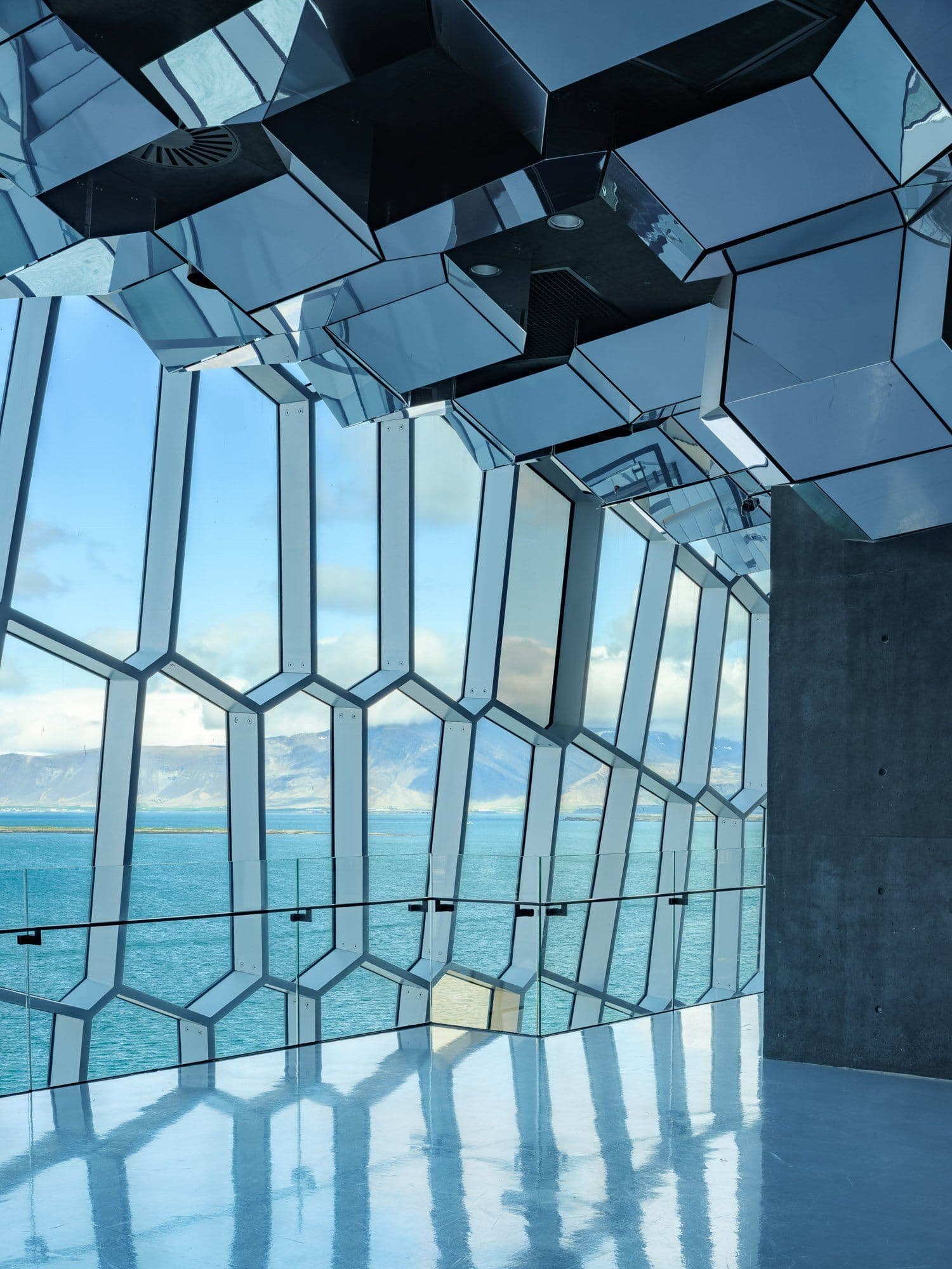 The ceiling is the same mirrored ceiling as in the foyer, designed by Ólafur Elíasson and the building's architects. Access to the hall is by elevator from the ground floor. Restrooms are also on the 8th floor.