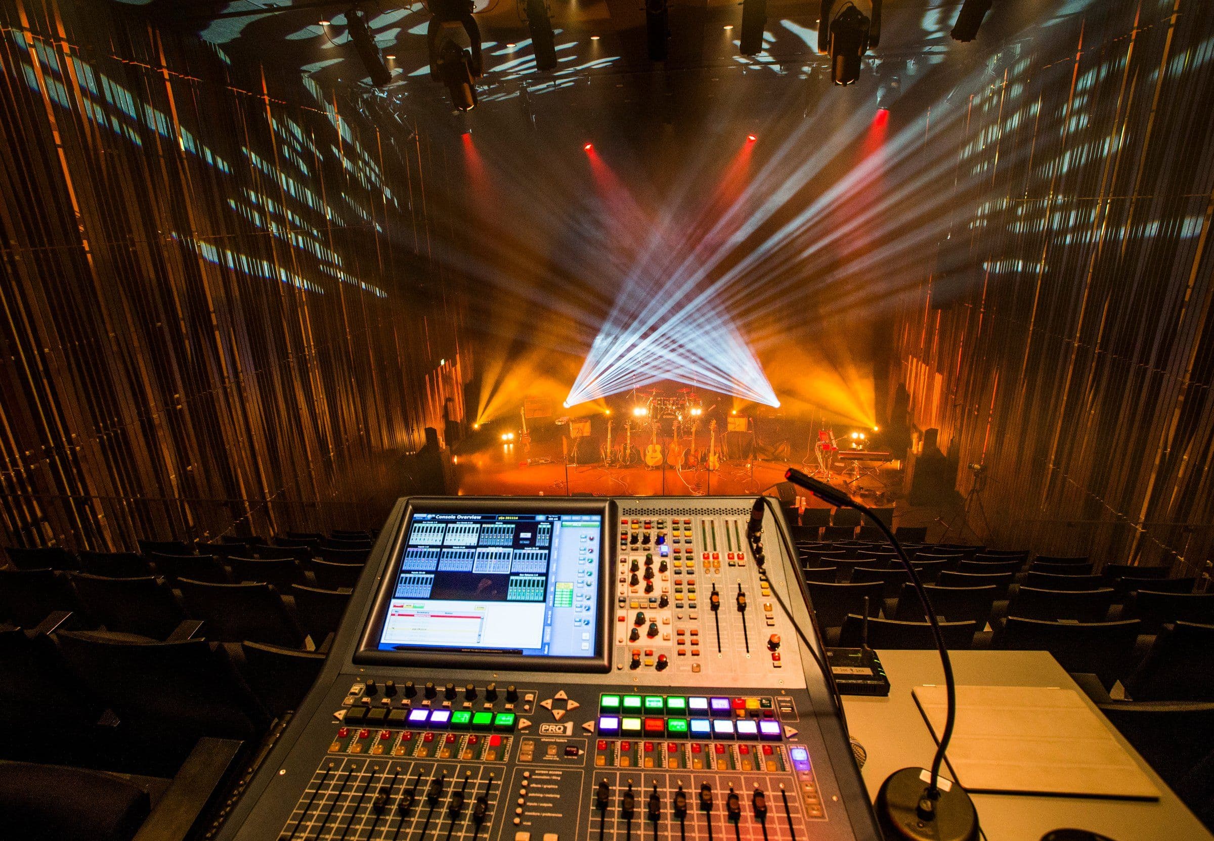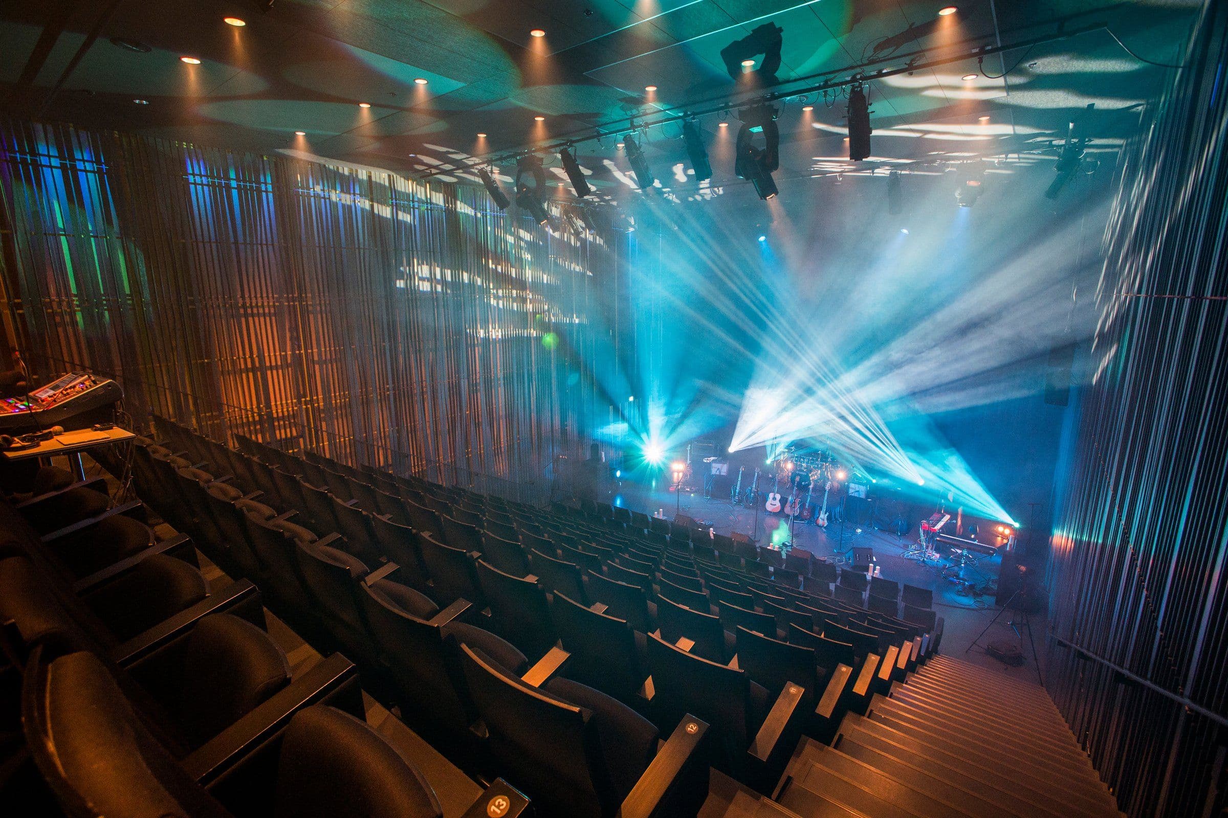 The hall features adjustable reverberation time, allowing Kaldalón to be tailored for different types of events. The seating is fixed and arranged on a sloped gradient toward the stage area. The stage itself is movable, and the floor can also be used as a platform for musicians.