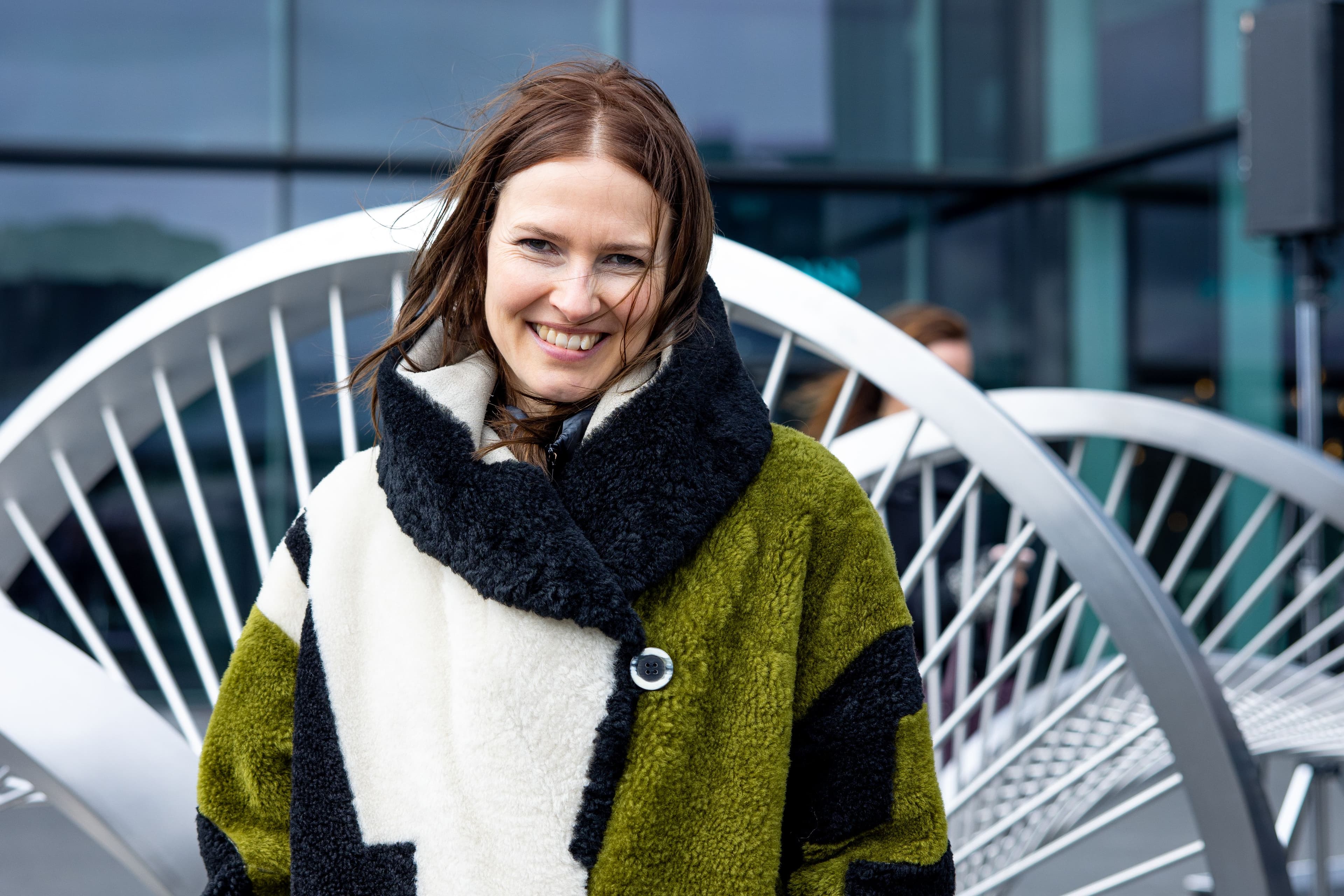 The artwork Himinglæva by Elín Hansdóttir, one of the nation's leading artists, stands at Hörputorg.