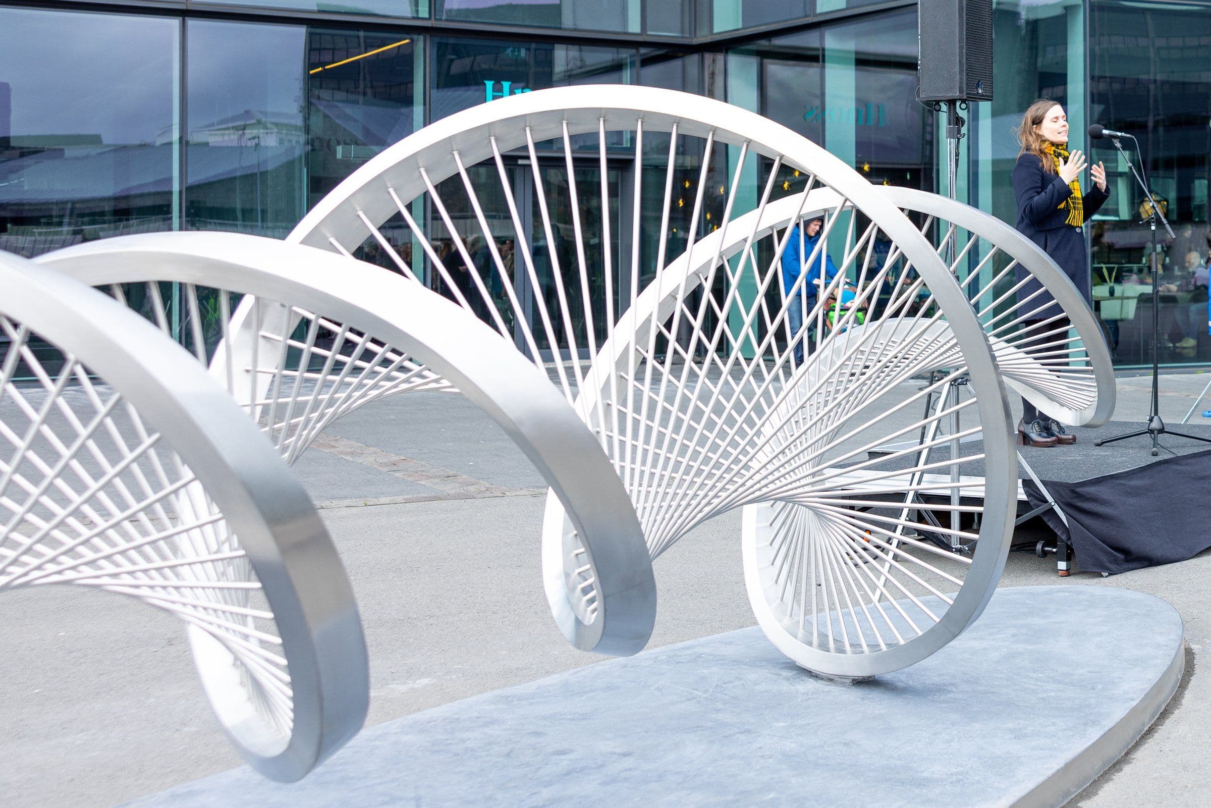 Himinglæva—a stainless-steel sculpture designed to produce sonic overtones as the wind travels through it—is an Aeolian harp based on a Lissajous figure, representing the shape of light beams reflected through vibrating tuning forks. The sculpture produces diverse sounds based on the force of the wind travelling through it, thereby directing the viewer’s attention to natural phenomena like the air around them. In Norse mythology, sailors who sensed the power of the wind and waves around them assumed that the mythical figure Himinglæva (meaning transparent, shining, and small wave) was embodying the water and propelling their vessels across the ocean. Alluding metaphorically to this legend, the harp is designed to attune the viewer to the natural forces around them through aesthetic means.